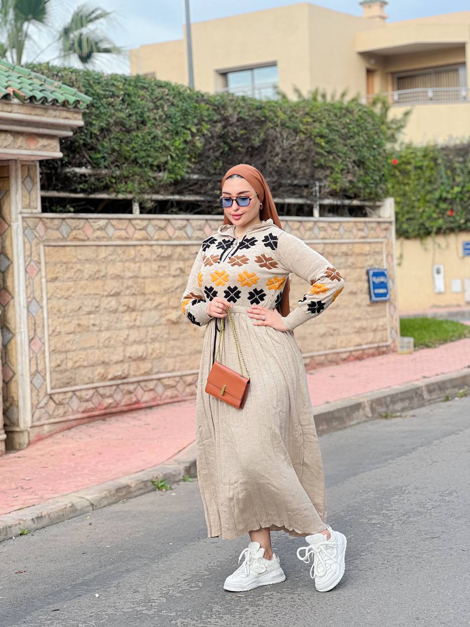 الفوقاني ديالو جا بتصميم دافئ بنقشة مميزة، مع سروال واسع ومريح كيعطيك حرية فالحركة وكيخلي اللوك متناسق من الفوق للتحت.