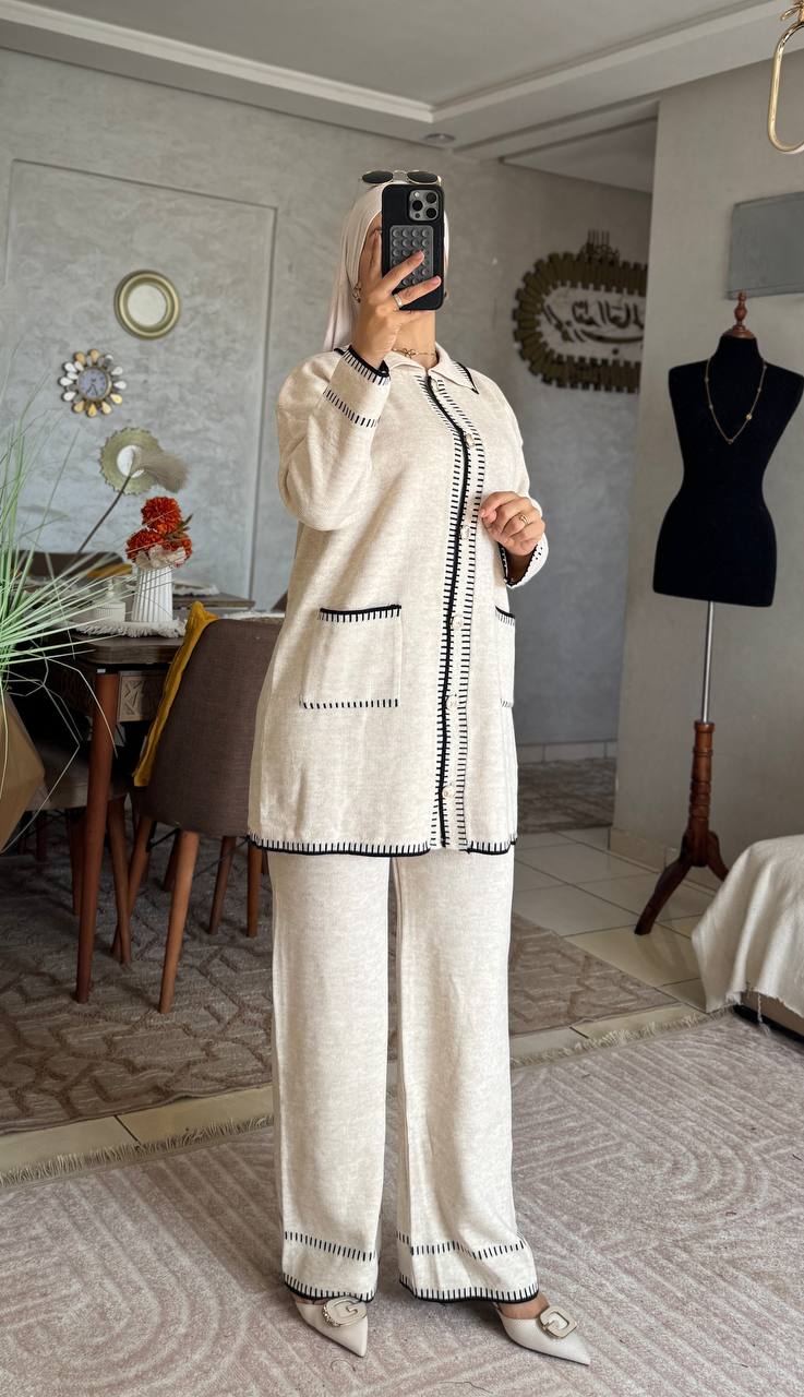 الطقم متكامل: فيه جوج ديال القطع (توب وسروال أو تنورة على حسب الموديل)، تقدري تلبسيهم مجموعين لإطلالة كلاس، أو تفرقي كل بياسة بوحدها وتنسقيها مع حوايجك الآخرين.